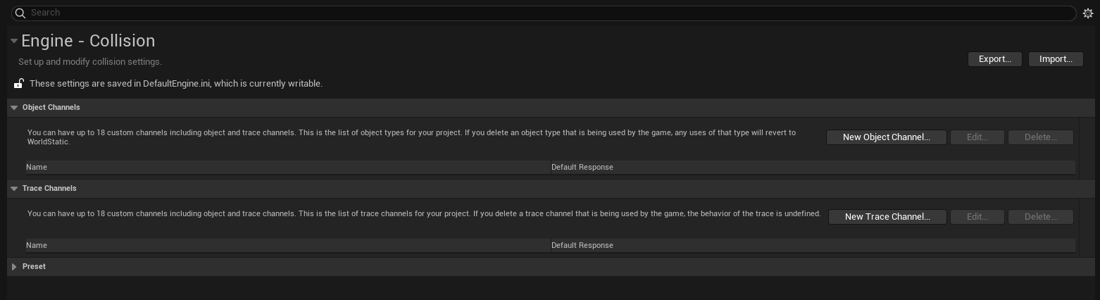 Edit > Project Setting > Egine - Collision으로 가서 설정할 수 있다.